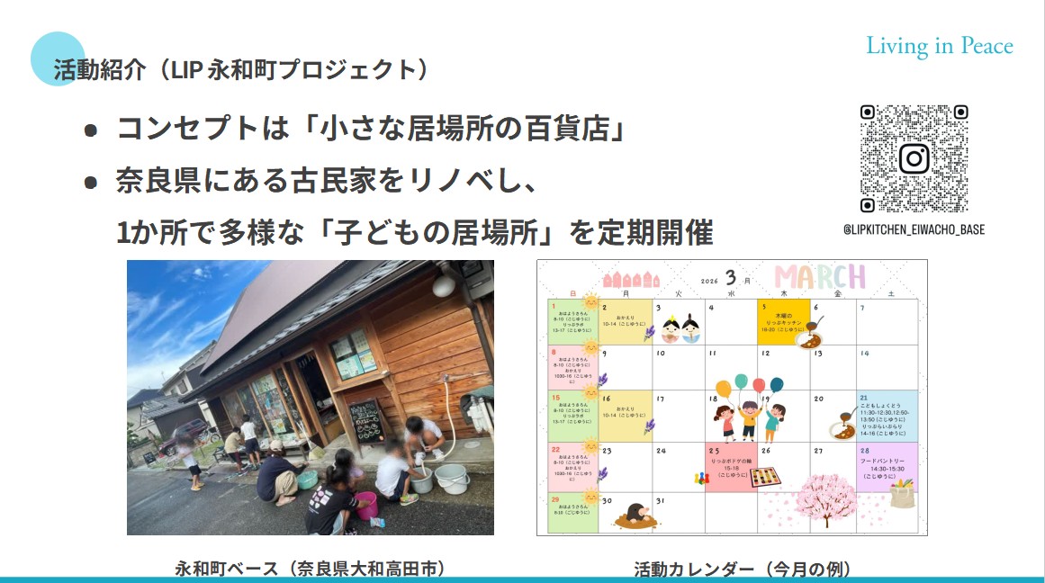 2040年の持続可能な居場所づくり 2026年3月14日にLiving in Peace(以下、LIP)のメンバーである松田が、対話型ワークショップ「2040年の持続可能な居場所づくりの『もがき』と『ゆらぎ』(主催:こど […] -