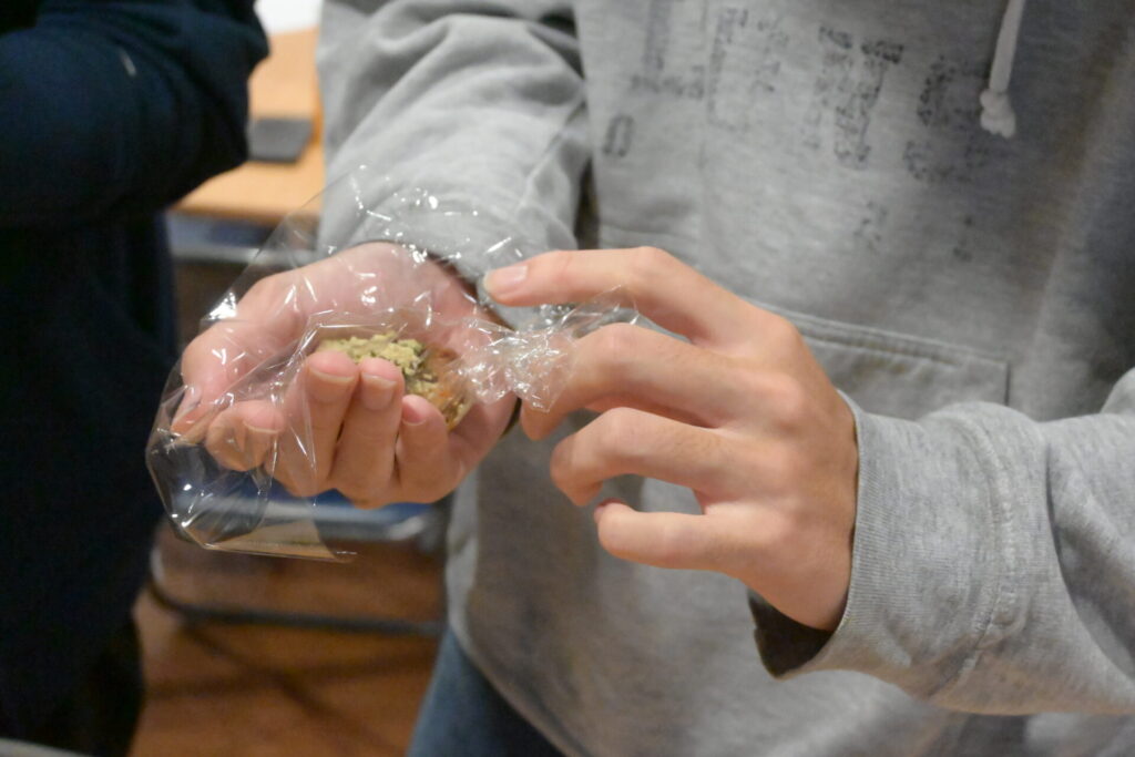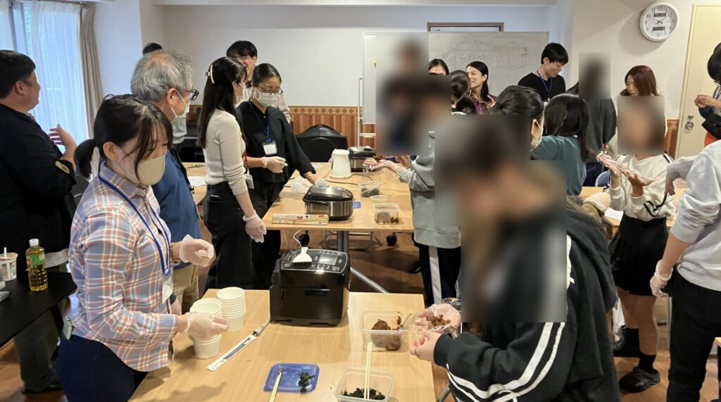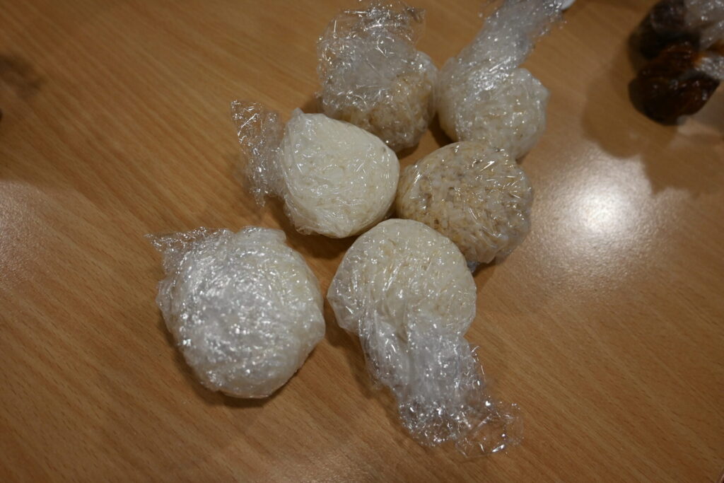 ワークの時間は、「体験」と「思考」の2つのワークを行います。体験ワークでは、「体の基礎をつくるお米とお味噌汁を作って食べてみよう」をテーマに、有機のお米とお味噌、お味噌汁の出汁や具材を菅野さんに用意していただきました。衛生面に十分配慮したうえで、講義前に炊飯しておいたお米でおにぎりを3種類(玄米、7分づき米、白米)と、各自でチョイスした具材を入れた味噌玉をつくります。