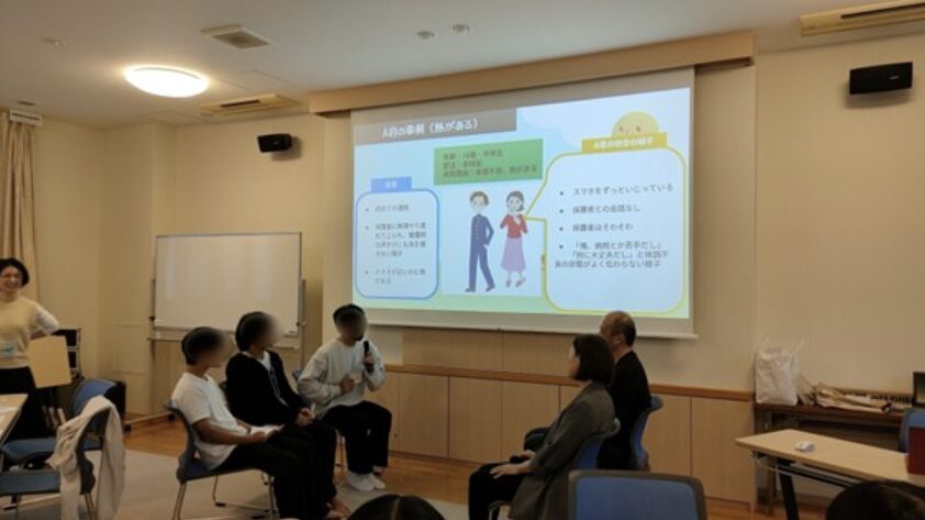 ワークでは、「看護」の視点からコミュニケーションの大切さを考える実践としてコミュニケーション手法の「オープンクエスチョン」と「クローズドクエスチョン」を紹介し、グループ内で中学生の患者AとBのいずれかを選んだ後、患者A・Bの性格や状況に合わせた質問内容を個人とグループで考えました。発表では、患者役を谷口講師が、付き添いのお母さん役は谷口さんが演じ、子どもたちは各グループのメンバーで一人の看護師を演じました。リアルな患者とお母さんの会話に翻弄されながらも、子どもたちは看護師の目線にたったコミュニケーションを実践し、その難しさを経験しました。