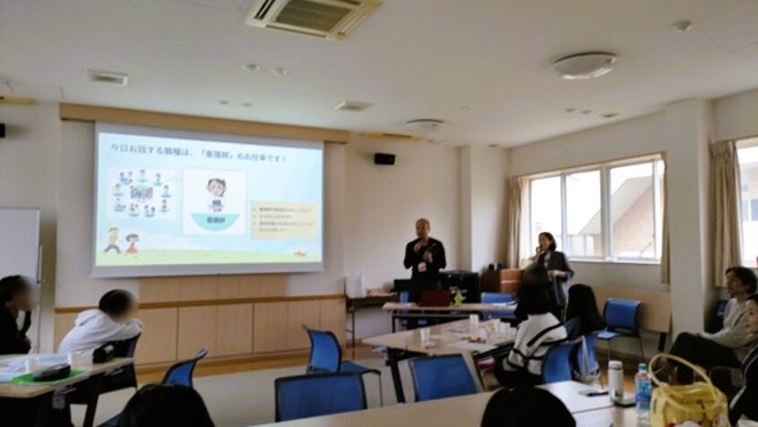 最後は講師からのメッセージ。ご自身の会社員から出産、子育て、看護師へという経験を踏まえ、「看護師はいつからでも目指せる」「色んな事があったけど、明るく元気に身近な人に丁寧に接することで、人生は開けていく」と語りかけていただきました。
